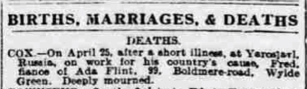 | Died:25 Apr 1917 | Yaroslavl, Russia | After a short illness | From newspaper notice | |