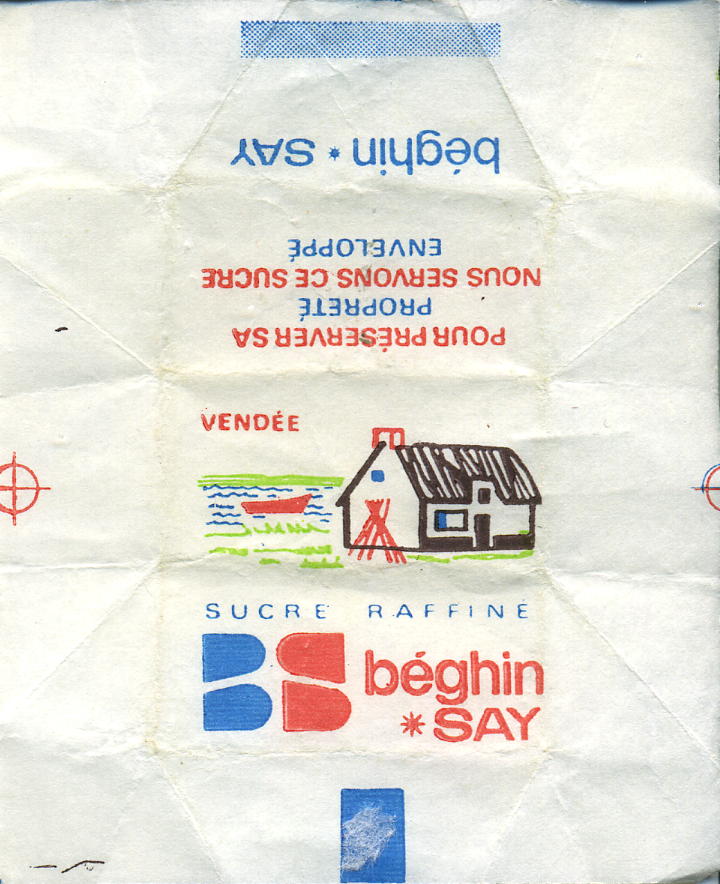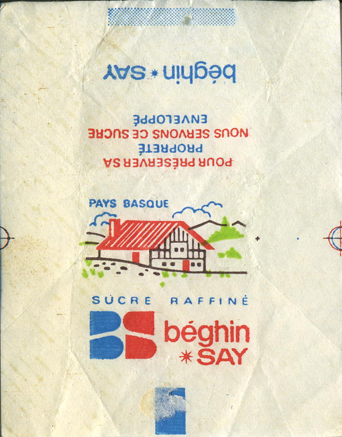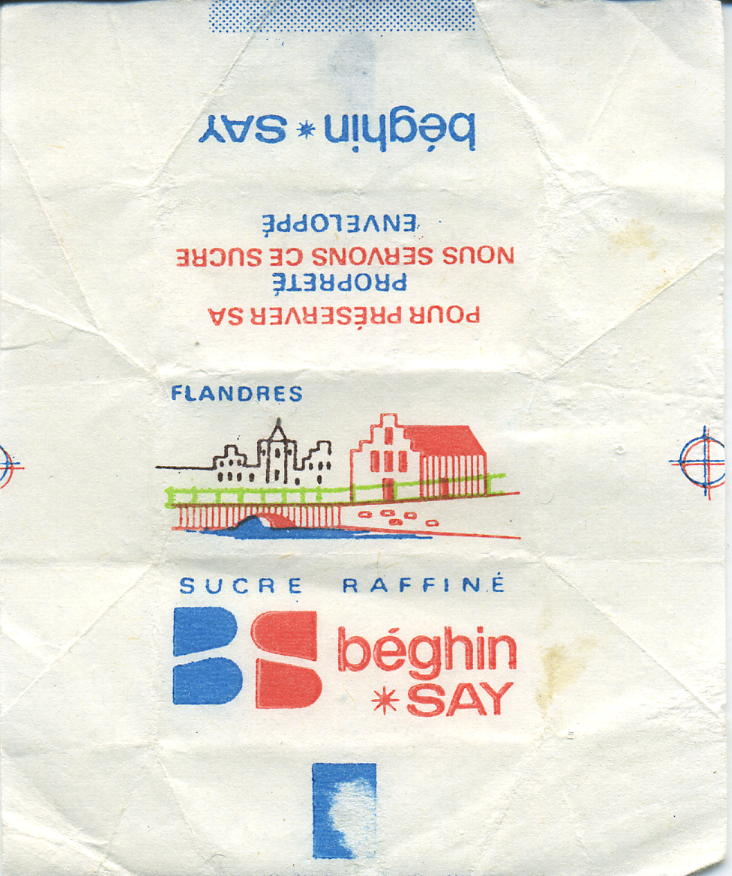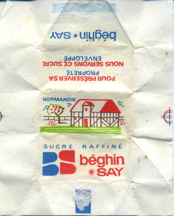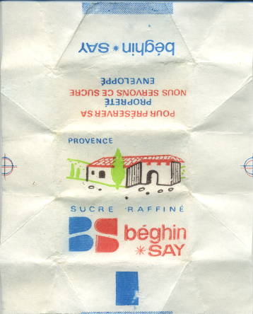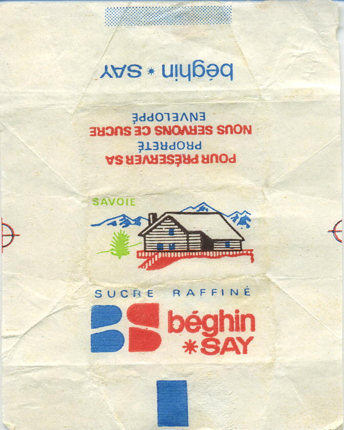 Type 4 : mentions "Sucre raffine" over the top of "BS Beghin SAY" - thick band - colour of houses is turquoise and red